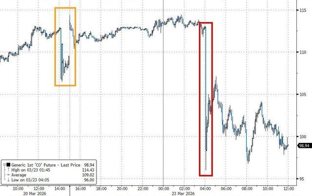 特朗普上周六宣布,伊朗必须在48小时内达成协议,否则将面临一系列针对公用设施和其他基础设施的毁灭性袭击。然而到了本周一,特朗普就取消了这一计划,称暂停打击能源设施,为期五天。消息公布后,周一布伦特原油一度跌超14%。