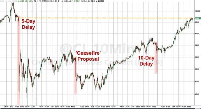 而到了本周四,特朗普再次在当日美股休市后,宣布将最后期限延长至4月6日。当日现货原油涨幅一度转跌、风险资产一度反弹,但市场似乎对于特朗普的口头干预逐渐“免疫”,随后各资产价格重新回到日内趋势方向上。